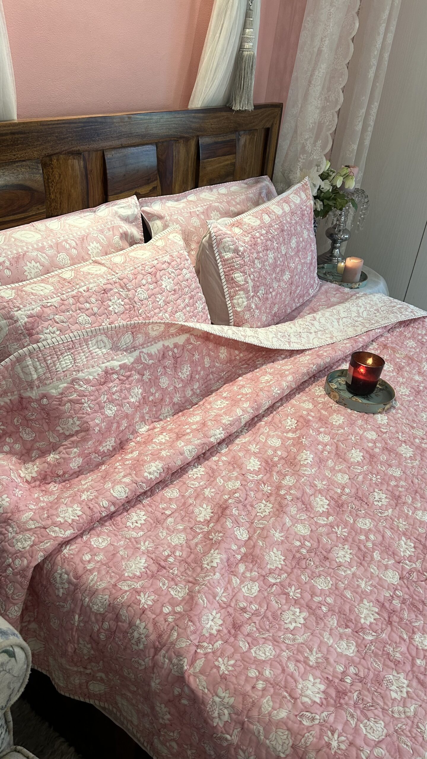 To complete the look, our set includes a soft and sumptuous bedsheet, also adorned with lush block printed floral patterns, accompanied by two pillowcases echoing the same motif.