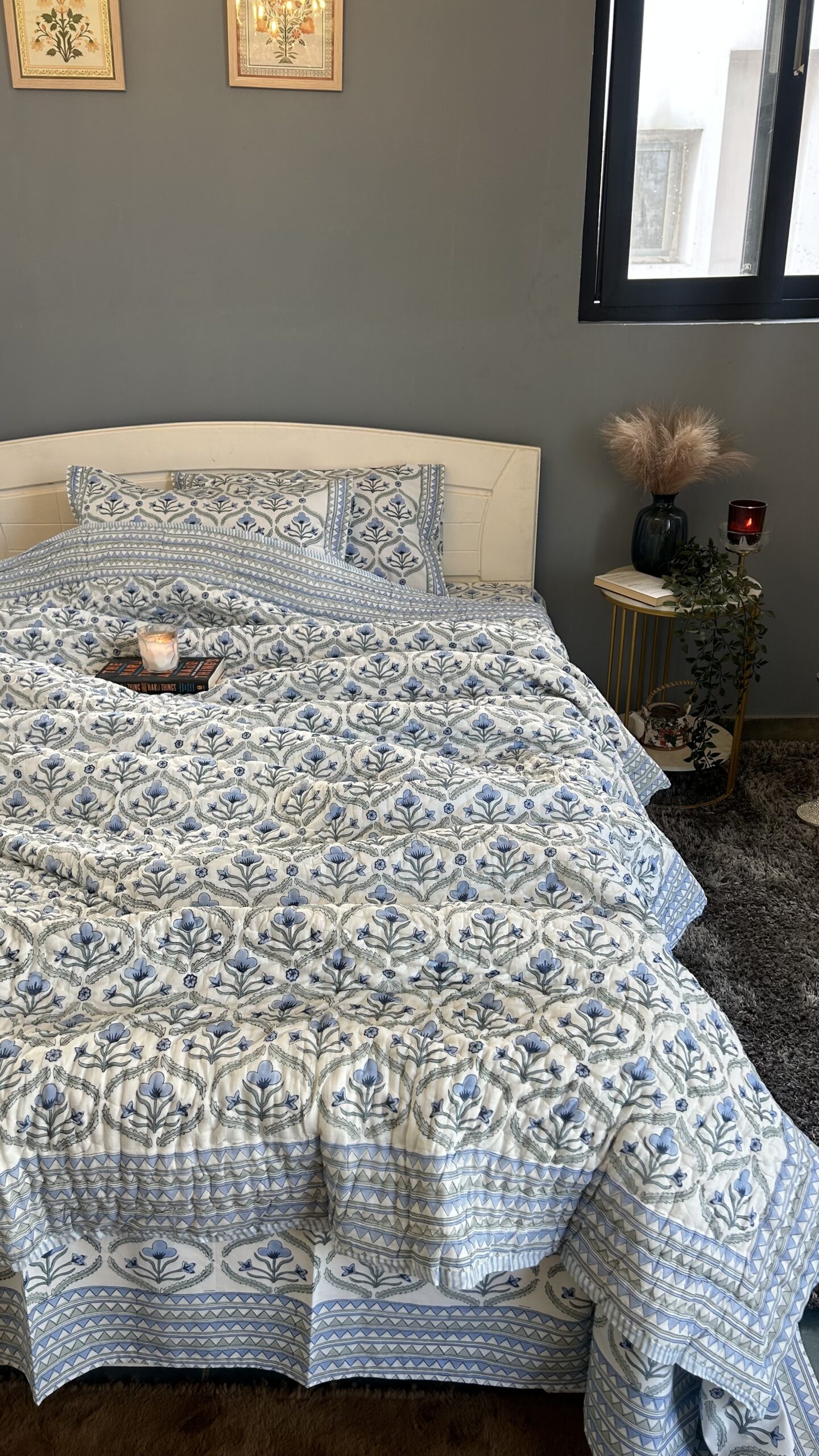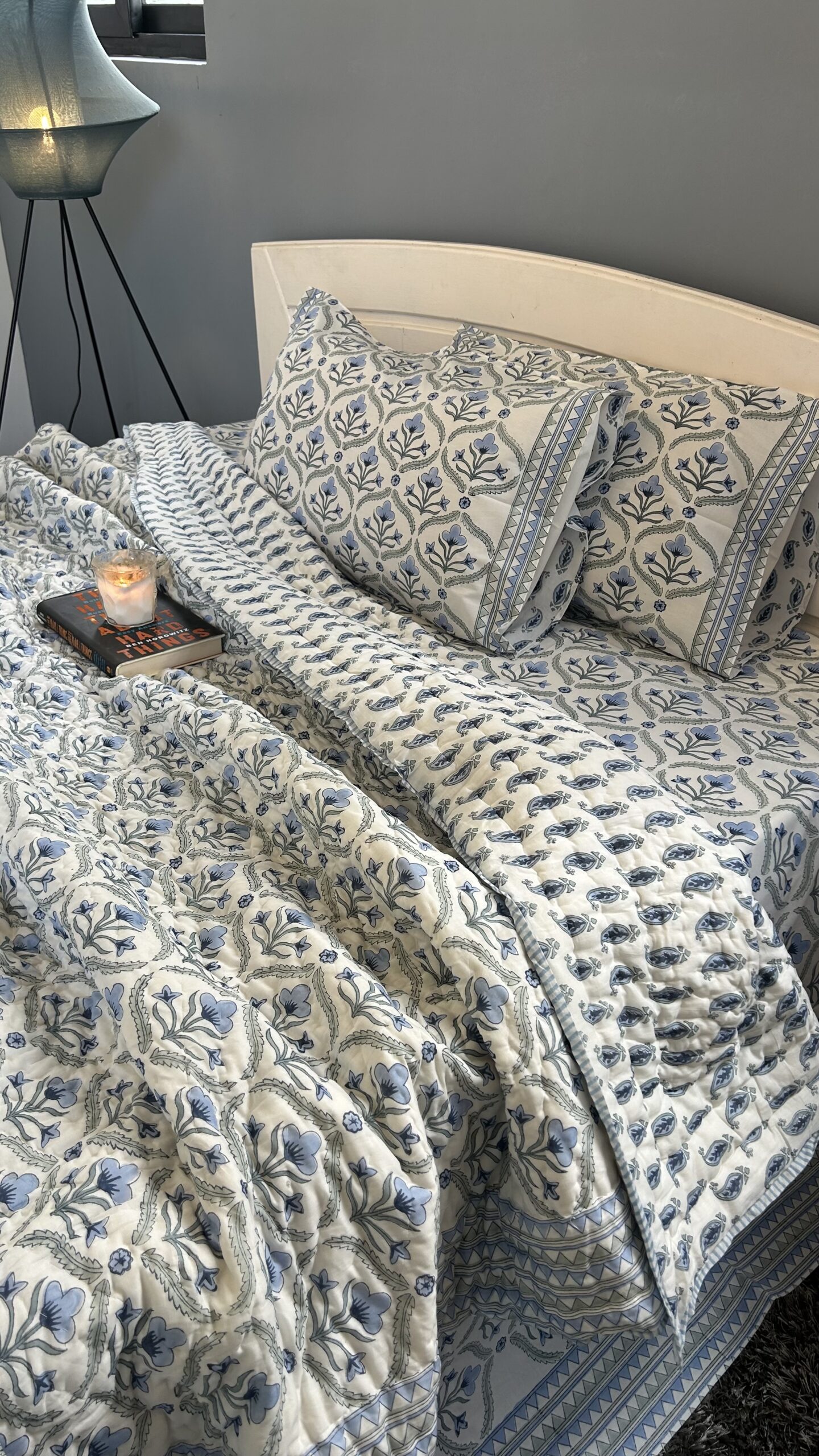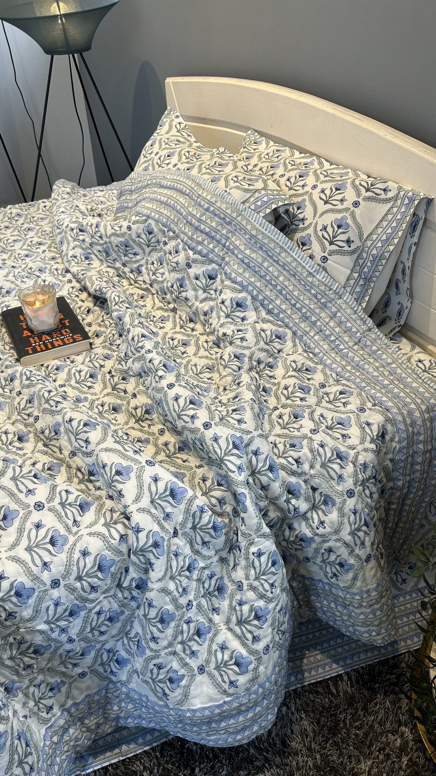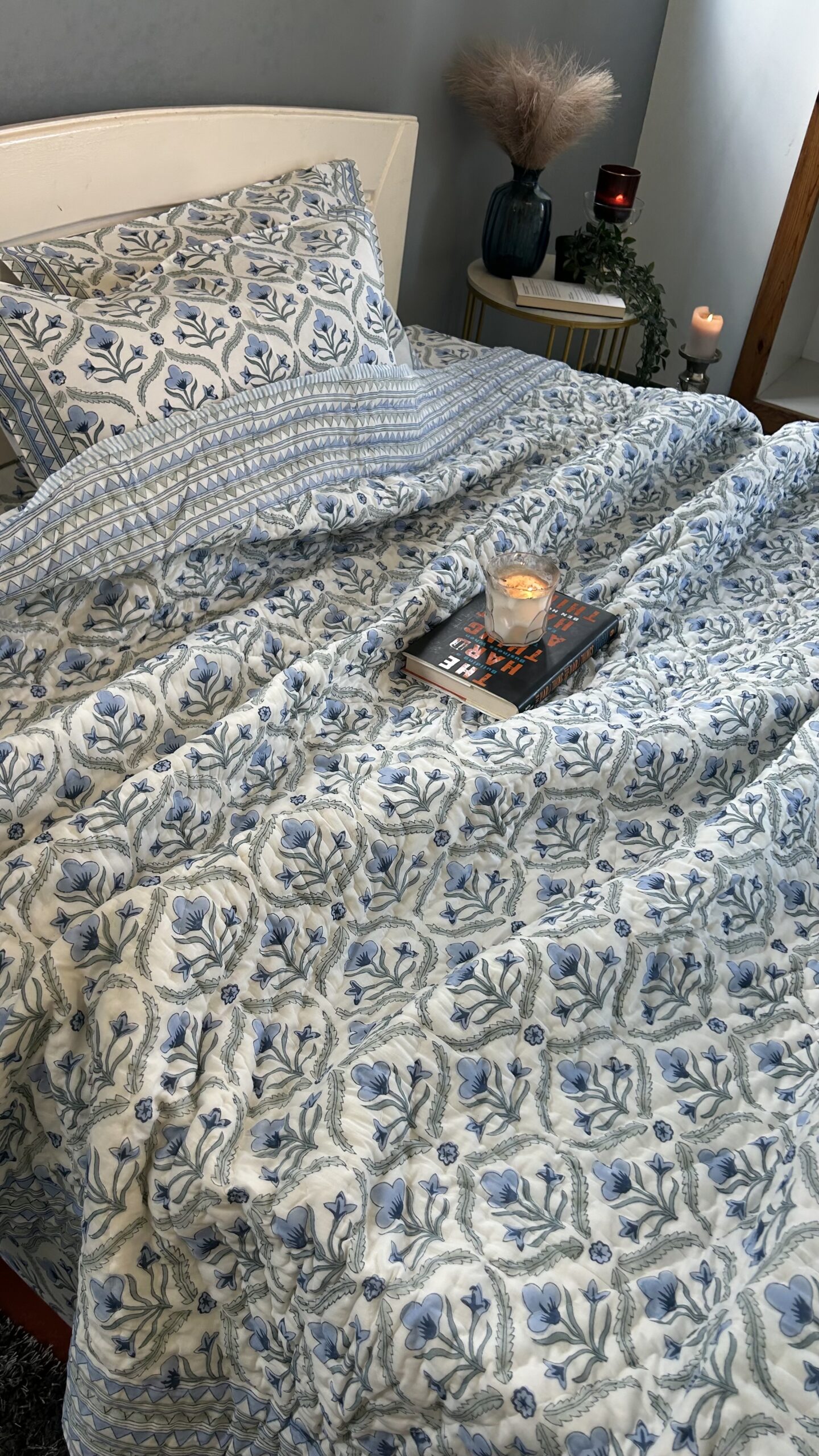 Bring timeless elegance and calm into your bedroom with our Indigo Blossom Quilt Set, inspired by classic Indian florals and traditional block-print artistry. Delicate indigo blue blossoms bloom gracefully over a soft ivory base, creating a soothing yet sophisticated look that never goes out of style.