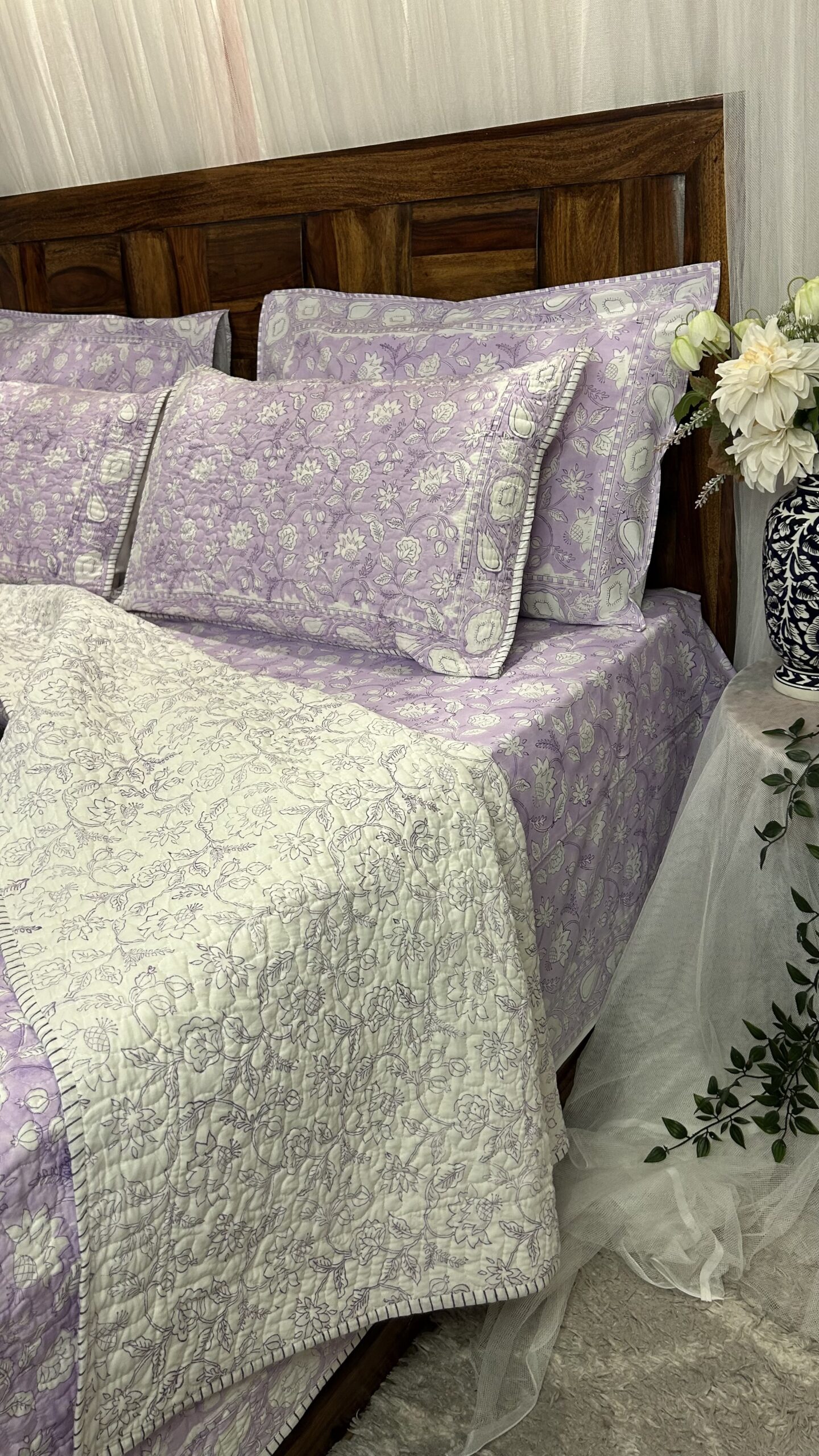This Lavender Meadow Bedcover and Bedsheet Set is a perfect blend of sophistication and comfort. Featuring a soft lavender base adorned with intricate white floral block prints, this set adds a tranquil, botanical vibe to your bedroom. The reversible bedcover offers versatility with complementary patterns, while the matching pillowcases complete the look. Crafted with attention to detail, the set is lightweight yet cozy, ideal for both warm and cool weather. A beautiful choice for creating a serene, elegant ambiance in any space.